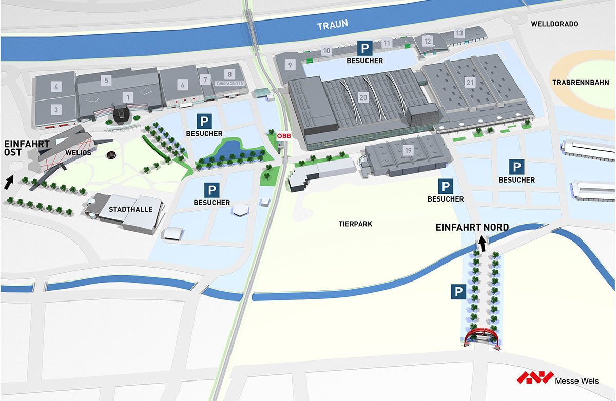 Im Zentrum von Österreich gelegen, mit Verkehrsanbindung an alle Hauptverbindungsstrecken, ist Wels aus ganz Mitteleuropa ideal erreichbar. Es stehen mehrere Parkflächen direkt am Messegelände zur Verfügung.