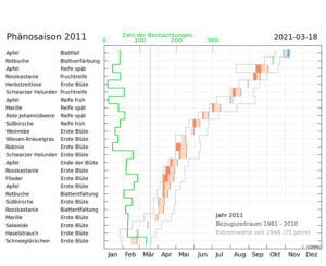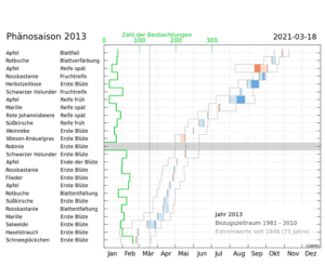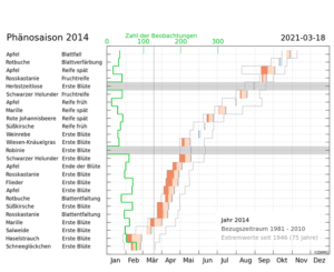 Phänologen beobachten bei Pflanzen die Eintrittszeiten charakteristischer Wachstumsstufen, die „phänologischen Phasen“ genannt werden. Darunter fällt der Beginn der Blüte, außerdem der Beginn der Blattentfaltung und Blattverfärbung.